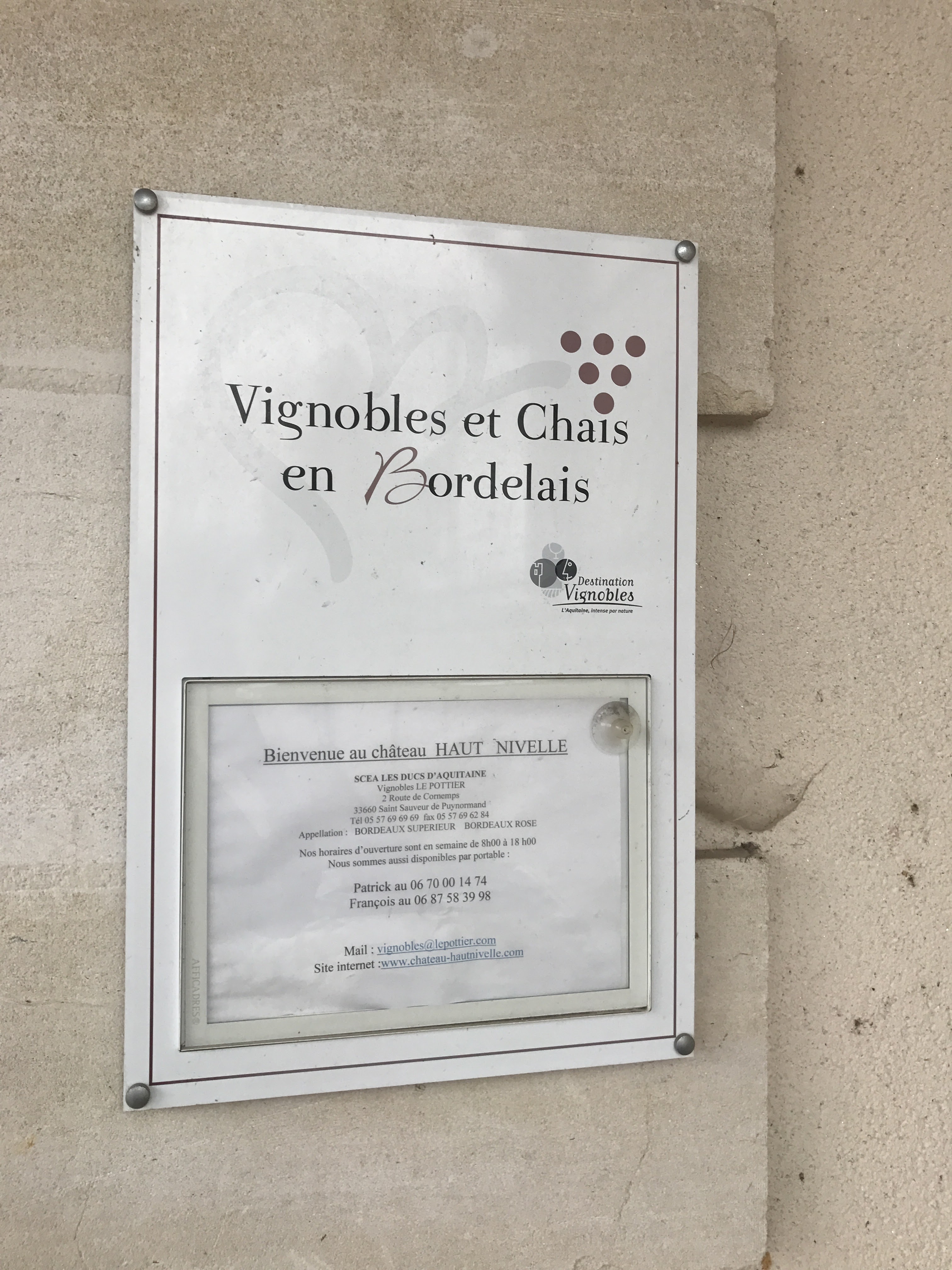 Voici toutes les informations sur le Établissement vinicole Vignobles Le Pottier qui ce trouve au Château Haut Nivelle, 2 Rte de Cornemps, 33660 Saint-Sauveur-de-Puynormand (33). Sur cette fiche vous trouverez les photos, l'adresse, les horaires d'ouverture, le numero de téléphone et les avis clients.Vous pouvez églement rédiger un avis si vous le souhaitez en bas de page.